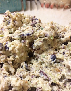 Once the chicken is cooked and cooled a little, throw it in the food processor with a couple of spoonfuls of greek yogurt (You can add as much or as little as you want. It might be best to start with a little and add to your desired consistency), 2-3 stalks of celery roughly chopped, 2 green onions roughly chopped, and about 1/2 a cup (give or take) of dried cranberries. Give it a twirl, and voila! I know it doesn't look like much, but it tastes great!